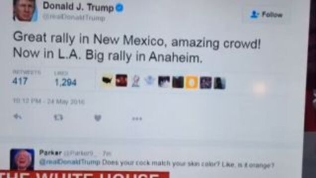 Late-night CNN viewers were treated to a brief moment of Cinemax-style steaminess during a segment that aired at about 1:30 a.m. Eastern time today. While on-air personalities were discussing protests at a Donald Trump rally in New Mexico last night, the screen behind them displayed a tweet from the Donald about the event. “Does your cock match your skin color?” read the first reply, which was also displayed. “Like, is it orange?”